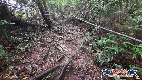 遇叉路無指標殊途同歸,樹林間大樹根裸露在地上,一手撐傘一手拉繩一步一步往上爬,不久又有叉路,左上直攻鷹仔尖涼亭,右路為山腰路較長而緩,也可通往上方涼亭處,於此取左續爬