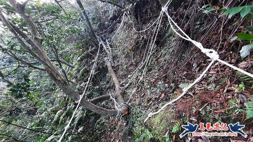 薯榔尖北稜線於1/12才由聯合艦隊熱心人士砍通,趁著今日天氣良好,趕緊來嘗鮮賞味一番,叉路進入後下坡處貼心鑿成土階,接下來要從崖壁外側通過再爬上,這一段剛施作繩索及搭設木橋,堪稱開路大軍經典傑作!