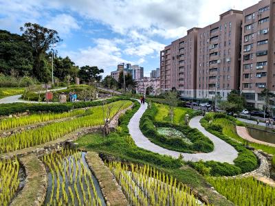 桃林鐵路就是所謂的林口線,初期主要運煤至林口火力發電廠,後來設立了七個客運站,提供沿線居民交通服務,這條支線在 2012 年底正式停駛, 於 2018 年推動「臺鐵林口線路廊活化工程」,分階段將林口線改建成桃林鐵馬道,在 2020 年開放通行,今年將現有蘆竹山腳橋延伸至海湖火車站, 全長達到 14.8 公里,最終將延伸至台 61 線西濱公路,今天主要是到達昔日的寶山火車站,由桃林鐵路寶山站前往大有梯田生態公園。續騎乘萬壽路約三百五十公尺,即可接上萬壽和平街口「桃林鐵馬道」,由此正式進入桃林鐵路自行車道,舊鐵軌沒有拆除,以鐵軌區分人行道及自行車道, 沿路也有許多健行者。