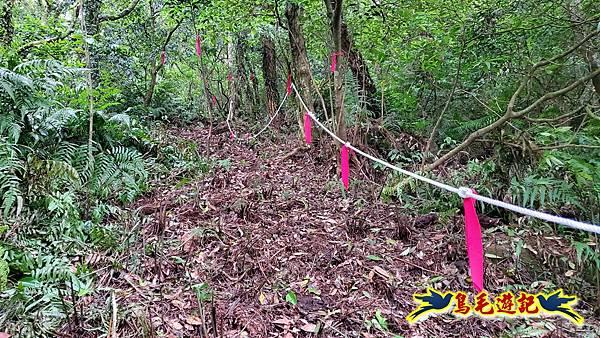 向天池山西南稜也是超級無敵陡滴~~,這陡坡經過蕨類/芒萁區的路線,路幅寬大且看起來是手工砍的(不是電動除草機喔),山伏天前輩開闢這路線有4大特點,除了路陡、指標/路線圖別具一格,另紅布條超多(是裝飾用還是避邪嗎?)、蚊子也多...
