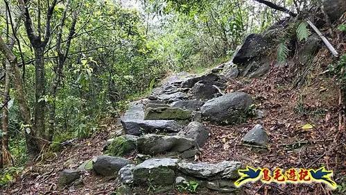 遠景古道剛開始從私人開墾地旁繞上來,進入樹林後石階古道路徑很清楚。古樸石階陡爬,小水泥橋過溪,再石階陡爬至上端,可望見產道對面輪胎步道。
