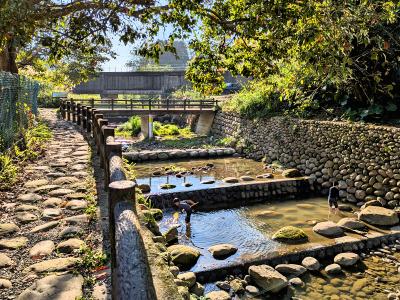 千層瀑布旁的鹿點咖啡千瀑店,這間景觀咖啡店算是著名打卡點,位在溪岸山坡處,環境景觀打造的美侖美奐,店門口植栽了不少鹿角樹,用來突顯鹿點咖啡的意象。進入真正的生態步道段,溪岸步道有綠樹遮陽,這裡的溪流段同樣有跌水工法結構體,溪水量少同様見不到溪瀑景觀,若溪水量足夠的話,會是一處很棒的夏日戲水點; 往上游看會有三處跨越溪流的設施,首先是消能塊組成的梳子壩,接著是步道可接的涵管橋,最後是石門大圳的過水橋。