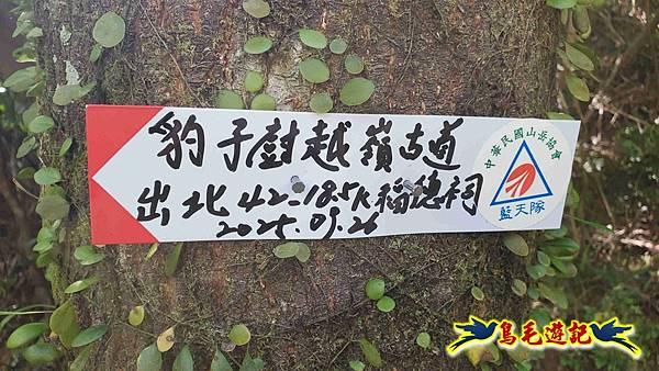 從豹子廚越嶺古道上端登山口出來大彎道處(約北42/19.4K),若往下走至北42/19K可接豹子廚越嶺保甲路至大茶壺,Fuli說要走產道上行先爬北豹子廚山。北豹子廚山,海拔627公尺,有土調局圖根點基石,山頂展望佳,可遠眺五分山、燦光寮山、牡丹山及草山群峰。