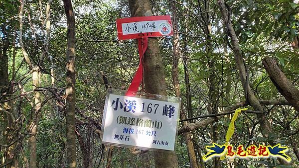 凱達格蘭山,樹林間小空地,無基石,藍天隊以其地名+標高重新命名為「小溪167峰」,小歇喝水,續前行轉為下坡,