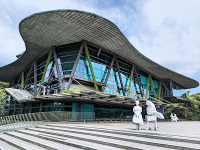 雲門劇場建築外觀,看起來就像是雲朵一般,雲門劇場就是雲門舞集的排練場,原在八里烏山頭的排練場意外燒毀,之後取得淡水中央廣播電台舊址經營權,重新打造了這座美美的雲門劇場, 此外場地園區的戶外,放置有朱銘雕刻的「白彩人間系列」作品。
