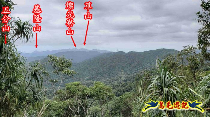 陡坡爬上後轉從岩稜左側腰繞直切而過,林間空曠處展望不錯,最左側有五分山氣象站白球(被林投擋到),稍往右則是基隆山,最遠處較高的山是燦光寮山和草山...