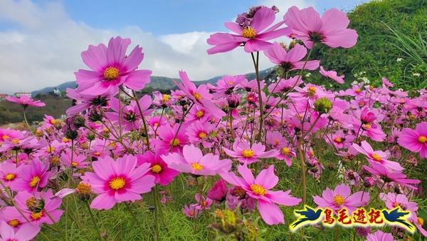 鵝尾山水田波斯菊花海美不勝收,現在有不少粉櫻初開,天氣也不錯,藍天白雲,微風輕拂,