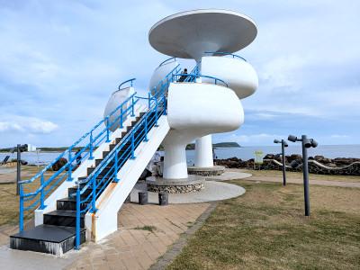海洋地質公園中心,外觀是仿中式建築,入口旁一座通地下的電梯,心想那應該是地下停車場用的,踏進大門後發現展間是在地下室,經由樓梯下到地下展間,裡面的空調冷氣夠強, 首先映入眼簾的是柱狀玄武岩景觀圖,平台空間上擺滿了史努比玩偶,老實說真的不懂其用意,或許只是吸引訪客用途吧;展間內有澎湖各地的地質解說,還有地質礦石實物讓你觸摸, 算是還不錯的知識性展館。