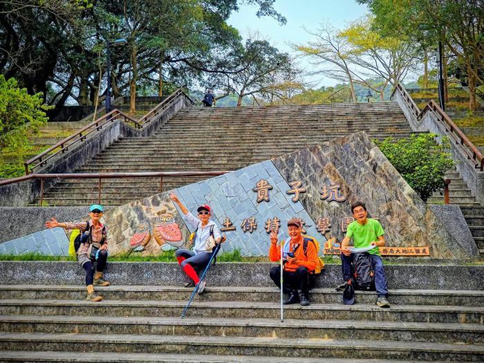 麵二隊5人來爬貴子坑山,從鍚安巷一路爬上,再走鄉間小路,經石頭厝,走到貴子坑水土保持教學園區,順爬貴子坑山,下山後,在樹蔭底下泡咖啡,吃四獸呀,非常愜意。 再來爬7OO多階上貴子坑山北峰。 中午在「三慈宮」休息吃飯,有水/廁/桌/椅,相當方便。 今日路線沿途碰見許多山友,算是熱門路線。
