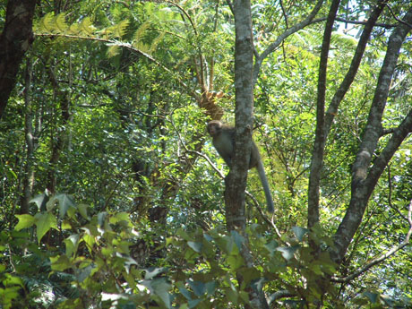進入月眉坑瀑布的後段路徑,由於一般戲水的遊客罕至,遭受人為的破壞性較少,周遭也沒有人為的草木栽植,因此,整個生態環境極為完整。此區塊的山林植栽分佈,是以森林底層的潮濕地指標植物均多,其中以全緣卷柏、姑婆芋、冷清草等草本植物最具代表性,而此種潮濕地的指標植物,也是螞蝗群聚的最愛之地。