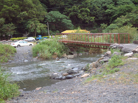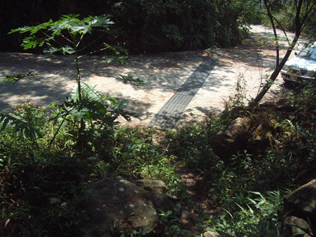今日「五峰幽谷」入口的輕鬆可得,是因為有上一周雨中探路之故。不過,不知是對「五峰幽谷」有過度的期待心或是我挑剔個性使然,總覺得「五峰幽谷」不該僅是這樣的吧!因為不論是進入「五峰幽谷」的沿途,或是當我步行25分鐘之後,來到「五峰旗瀑布」第一層瀑布崖頂上方的溪谷處;或是我興沖沖的換下登山鞋,特意著上新買的溯溪鞋再往溪谷的上游走去;也辛苦的翻越了幾處渾圓的大石頭後,終是踏入了所謂的「幽谷入口」。 但呈現在我眼前的所見,卻是散落在溪谷中的紅白垃圾,以及近日雷雨過後溪谷中枯枝與雜草滿佈的滿目瘡痍,讓我無法將此荒涼、破敗的畫面,描繪成他人口中能構築「光與水美景交織」的景觀,或是所謂「清幽秘境」的幽意氛圍。甚且連在青峰翠林掩映下、渾圓大石頭上的斑斑青苔,也都失卻了他人鏡頭下的活潑生命力,而顯得乾褐、無生氣的衰老氣質。如此的「幽」谷景象,讓我的心情卻無端的「憂」了起來!! 續開車走「宜2鄉道」前行到尚未進入「五峰旗瀑布」的入口區域,狹小的左轉小路上有指標導引著可前往「聖母山莊」的步道,車行從此小路進入下方的「親水橋」過後的路邊,尋一空曠處停車。 |