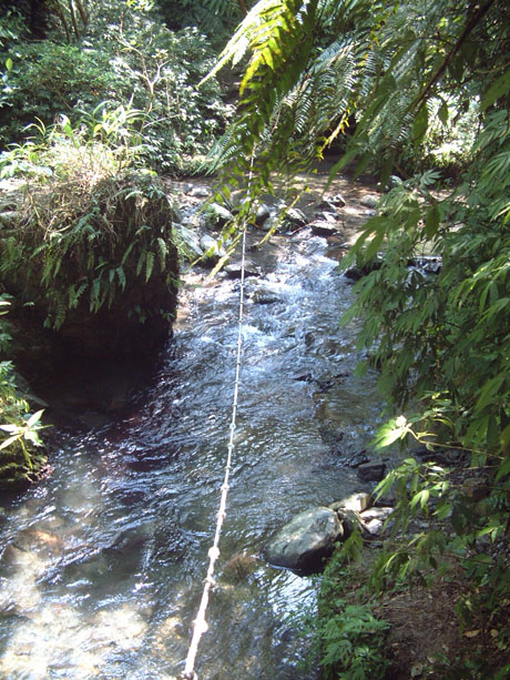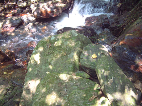 續前行來到需開始溯溪要進入「月眉坑瀑布」的泥濘山徑,我小心翼翼的攀繩來到溪谷下方時,重新拿出有備無患的溯溪鞋,從此路段開始踏溪溯往「月眉坑瀑布」。不過,當我一踏入清澈又清涼的溪流水中,不由童心大發的潑水向停歇在溪石上「豆娘」;也很認真的往溪水深潭中,與水底下的水生昆蟲玩起「踏影子」的追逐遊戲。 |