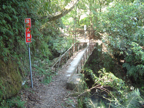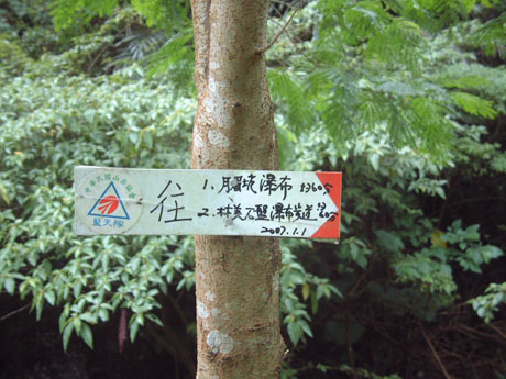 過紅色舊鐵橋的溪畔樹林下,藍天隊釘於樹幹上的登山指標→往月眉坑瀑布約60分,往林美石磐瀑布步道約60分。碎石鋪設的產道上兩旁大都有綠蔭遮蔽,正午的時刻漫步其間,毫無悶熱的暑氣;再加上下方「得子口溪」的潺流聲一路相伴,雖是一人的獨行卻也是滿心愉悅的快樂。