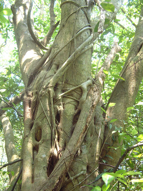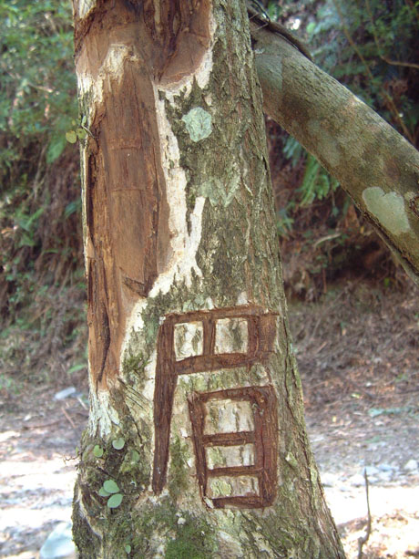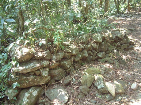 說起這「方形石砌駁坎」的地標,據我已看過多次「燒炭窯」的經驗判斷,再加上面向我剛剛來時路的山徑方向,也開有一個可供人進出的缺口;以及周邊山林內多屬於「亞熱帶闊葉林」的植栽生態體系,及木質十分堅硬的闊葉樹林的分佈作分析,我判斷這「方形石砌駁坎」應是早期先民在山林內,墾植相思樹後的「燒炭窯」成份居多。 |
