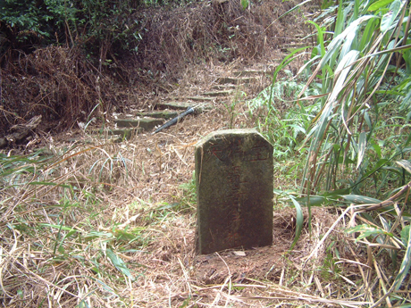 依著蜿蜒有序、排列整齊的石階道一路下行。在古老石階道的右側,當瞥見已淹沒在草叢中的「天佛堂觀音佛祖」的古石碑時,「串空湖古道」的終點處便在不遠的「石碇埔」民宅上方。