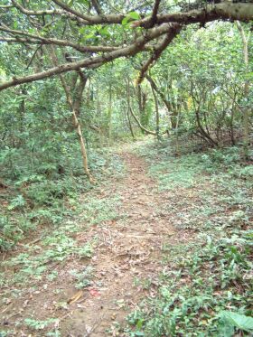 過土地公廟後右側的山路,我們於九月份初探時,即曾走過其下方的溪流,故今日乃由土地公廟的左側路向前去。再前行遇到山壁大坍方,一行人小心通過、再跨越一小溪後,轉上行的路徑,仍是接續上九月份初探的路線,此路線往前行是通往山林中,有一古墓、墓碑上橫書有「靖邑」字樣的方向前去。