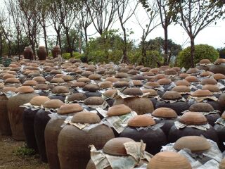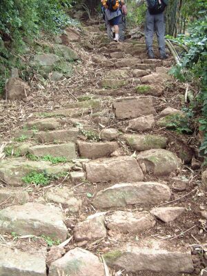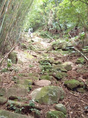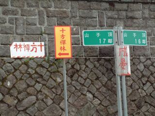 經過「十方禪林」的農地後,一行人便已尋著「山子頂」步道的入口。入口處的右方民宅庭園內,有數十個醃製物的罈甕散落著,「數大即美」的美好印象,令人一見便起歡喜心。於此入口的起始處一直延伸到山頂上方的整條步道,鄉鎮公所正進行鋪設、翻修步道的施作工程,整個步道雖尚不至於是開腸剖腹般的淒慘狀,但是,整座清靜山林原有的砂岩石頭步道,被開挖成體無完膚的猙獰面目,是我表達當下所見所聞的直覺感想。 我真的是不解,如此陡峭的步道,除了是當地居民以及性喜接近山林的登山客會前來造訪外,一般西裝革履或是足登高跟鞋的美麗觀光客,會前來此地嬉遊的機率應是微乎其微,那鄉鎮公所何以需先破壞原有的清靜山林,以及苔痕滿佈的樸拙步道,再大肆整治成堅硬、寬距相同的花崗石石階道呢? |