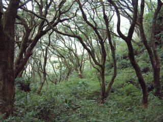 一路陡坡的步道高度,也讓我懷疑此一古道的真正用途,甚且懷疑是否蕭郎看錯了路,否則怎會有如此陡峭的古道呢!一行人約是行走近一個鐘頭的陡坡後,終於抵達一平緩、寬闊的森林茂密處。我於休息的雜木森林下、厚實的落葉地表上,驚喜的發現,有許多「青剛櫟」的堅殼果實自樹上掉下;之後再續前行的沿路上,也有許多的堅果掉落,我欣喜的逐一揀拾,想利用它來裝飾今年的聖誕樹,並也分享給同行的夥伴們。「青剛櫟」是屬於殼斗科、常綠的喬木,在少有人為破壞的低海拔闊葉樹林中,尚能幸運的揀拾到前端突尖、像是杯子的殼斗果實,於我喜「拈花惹草」的拾荒習性,是有種遇見老朋友的喜樂心情迴盪著、、。