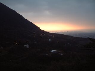走出「楓樹湖觀光農園」的牌樓時,今日的探訪行程已結束,此時101縣道的遠方天際,一輪紅豔的夕陽正緩緩西下,紅霞光圈擴散的瑰麗色彩,搭配近墨色的天際線以及樹梢黑色剪影的前景,構成一幅絢爛的水彩潑墨畫。我不禁佇立路旁,欣賞著「秋聲暮色伴楓山,清水斜暉戲絳瀾」的大自然美好賞賜、、。