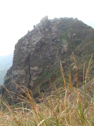 在午后亮麗陽光的伴隨下,續前行的路段,其驚險與難度尤勝於早上的行程。此時,強勢的東北季風驟然狂吹的結果,一般沒有帶子的軟帽,是無法發揮遮陽的功能;張狂的髮梢橫掃過我臉部、也遮蓋住某部份的視力範圍;且腳下每一踏踩出的步履,亦需小心翼翼的謹慎,而雙手更需隨時、隨處緊抓住周邊任一的小樹或茅草的根部,以銷抵一路下滑的陡坡斜度。如此手忙腳亂的踏伐步履,實有違我一向行走古道的悠閒步調,可是既來之,我便勢需融入此種蹇行的路況,迅即調整我悠哉、散漫的步調,否則稜線下方裸露的岩石區塊,以我肉腳的資質,倘稍有鬆懈、一不小心摔下去的話,「粉身碎骨」的形容詞,應是我不自量力前來攀登此行程的驚險下場!因沿途有如此緊抓樹幹的動作,致到如今我的雙上臂,仍是酸痛不已、、。