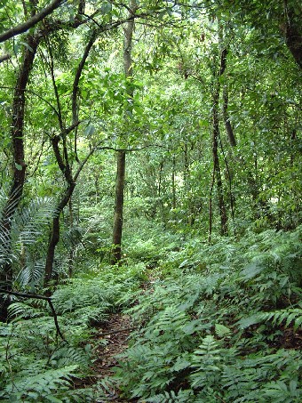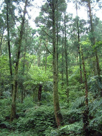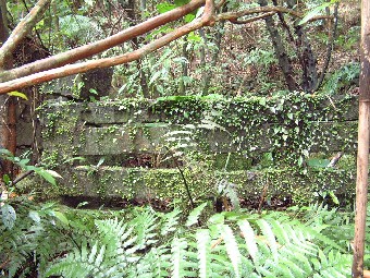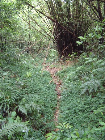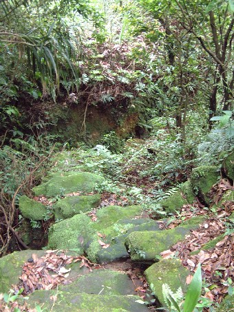 | 車停的橋頭前右側,有一寬大的產業道路,閃過鐵門側、循溪往上行,沿路的山林景觀,有份屬於低海拔次生林所建構翠意盎然的優美。倆人走到產道的路底,左側長有枝葉茂盛的大片「毛桃」果園,但卻未見有桃子的蹤跡,我心中不禁納悶著,再過一個月就是端午節;也就是桃李採收的季節啊!但是,桃子都跑到哪兒去了呢? 毛桃果園的右前方、竹叢林內,有石厝的斑駁牆面出現,石厝的佔地面積也寬廣,倆人越過石厝前方的竹叢、草地,往右側方向再前行約是30公尺的距離,林下右側出現明顯的路痕,看來應是昔時「後寮子」山區越嶺通往「四分子聚落」的古道。 登山界的前輩-藍天隊描繪的路線圖上,僅是標明有一條粗線的顯示,卻未標示出「線條」意指為何。為了這條古道的名稱,我與蕭郎琢磨、思考甚久,後來決定依著我們貼近古道入口、周邊電線桿上「四分子」的地名,將此古道喚為「四分子古道」。 |