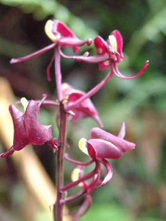 蘭科,葉形:卵形、長橢圓形,台灣原生種、花莖伴新葉生出,具有明顯之翼狀稜脊。花暗紅色;唇瓣倒卵形,先端向下彎折,邊緣有細鋸齒