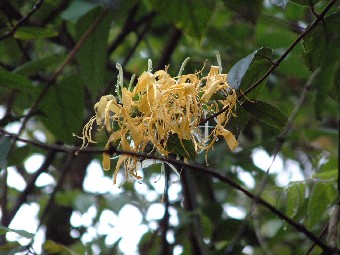 花名:金銀花 忍冬科、常綠攀緣性藤本。葉對生橢圓形,末端銳。花也成對著生,二唇狀,小蕊細長,伸出花筒之外,花初開時白色,然後逐漸轉黃而至凋萎,因此枝頭上總見得到黃、白花共存的情形,這便是它的名字「金銀花」的由來。金銀花是著名的中藥,也可以製作為清涼飲料,有時也被用在庭園作為綠籬植