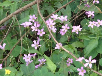 酢漿草科酢漿草屬、別名:大本鹽酸仔草、紫酢漿草。葉子根生呈叢生長,有長柄,小葉3片,倒心形,花粉紅色,5個花瓣,多年生草本植物,鱗莖發達,以鱗莖來繁殖,在台灣不結果