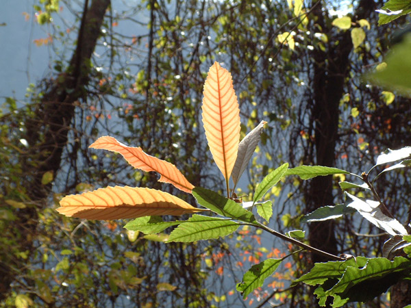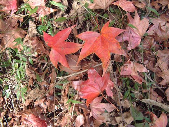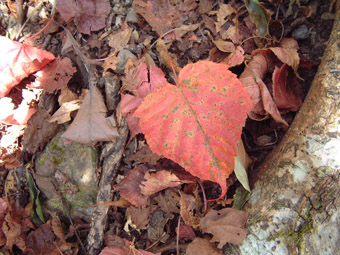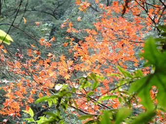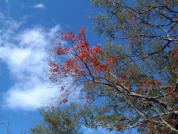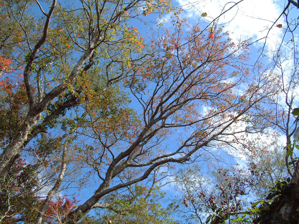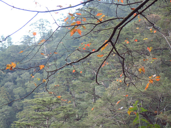「霞喀羅古道」的範圍橫跨新竹五峰鄉、尖石鄉等山區,除是扮演早期泰雅族部落前往外地的交通要道外,在日據時期還是理番的越嶺警備道路。時空變遷下的「霞喀羅古道」,早已喪失聯外交通的功能,但也因為是位處偏遠的深山境地,沿途原始山林的自然風光,展現其清新的面貌,讓人對大自然奇幻的手筆感到無比的驚訝,便有不虛此行的雀躍心。 初進入古道的不遠處,我被右側山坡地的優雅杉木林所惑,便決意下車行走,但,卻也連累了與我同車的「一對儷人」。初冬、卻是晴空萬里的「霞喀羅古道」上,擁有最美麗的山林顏色,層層覆層層的漸層色澤,以及各式各樣酪黃、酡紅暈染的葉片,遍染上一望無垠的藍空。在碧藍天空的襯托下,抬頭仰望酡紅暈染的清麗景致,令我恍若置身在當年異國賞楓的時空中、、。 |
