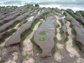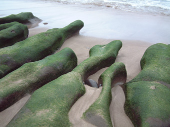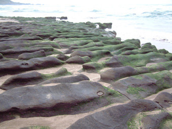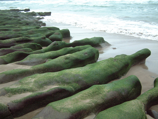 以我是生長在都會區的「台北人」、再加上喜歡「趴趴走」的個性而言,連遠在北極圈的「北角」地區都曾踏踩過;但是,鄰近北台灣的石門鄉,卻是我獨獨未曾踐履過的一塊土地,說起來,總是覺得有那麼點遺憾的心情存在著!!幸是今日的大雨滂沱,我總算有機會停留在石門鄉,好好品味這臨海小鄉鎮的獨特魅力! 「老梅」,是屬於石門鄉臨海的一個小漁村。據「蕭郎」從老家住在老梅的山友處得知:『老梅的地名原是平埔族原住民的地名音譯過來,發音並非像是字面上「老梅」的台語發音,只是有點像而已』。因此也非是我原先從網路上得知的:『因為有源於陽明山竹子湖的「老梅溪」穿梭、經過小漁村入海而得名』的典故。 雨中「老梅」的田野間,空氣裡悠靜的氛圍,讓人感受到異於都會區擾嚷的聲響,依著Tony夏日前來探訪過的旅記,我車停於「凌虛宮」附近,沿著「老梅溪」畔狹隘的鄉間小路,慢慢的往大海的方向走去。 聞到海的味道、也聽到拍岸的狂浪濤聲,更看到因海水侵蝕海岸,形成各種不規則鮮綠塊狀的「石槽」,安靜的躺臥在潔白的沙灘上,無聲的接受海浪在其身上反復拍打而產出的白色泡沫。大海的狂犼聲,加上廣袤海岸的強風,是無法讓人有優雅的動作或心情,近距離的欣賞、接觸「石槽」的樂趣。不過,此種令人嘆為觀止的海岸奇景,縱是我的手及身體都已冷到抖顫的情況下,我仍有不虛此行的喜樂心情。 |
