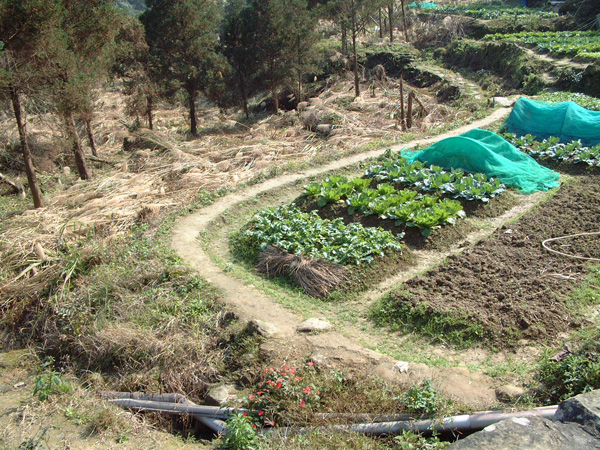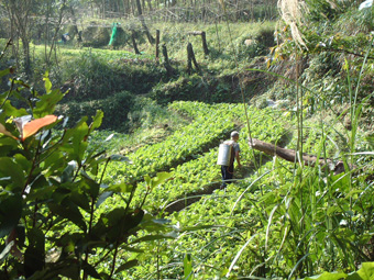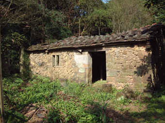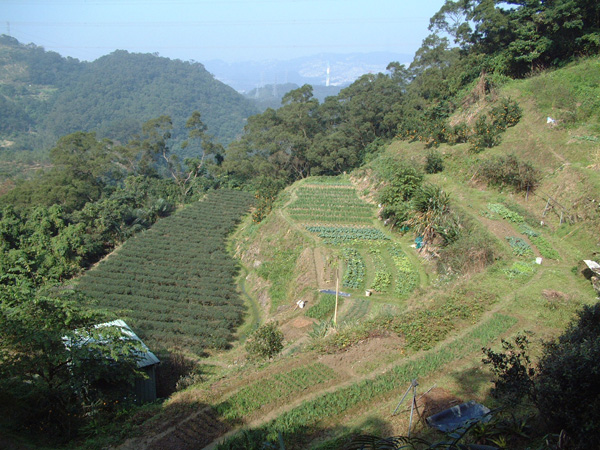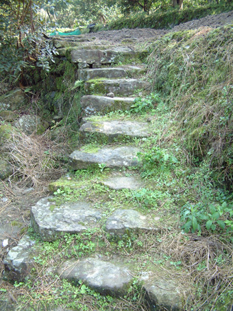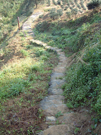 | 通過尚是幼苗的杉木林區後,左側有一小塊的植茶區鮮綠的透出新芽,右上方的古厝側牆仍是隱約可見。跨過第一次的淺溪澗往青苔小徑走入,只見沿途有堆疊有序、青苔滿佈的石階滿佈在山林間,左方的溪流潺潺聲音也清楚可聞。 我不禁暗忖懷疑著,如此的青苔石階道,會否才是真正的「茶山古道」呢?此青苔小徑一直深入到跨過一座新穎的水泥橋,以及再兩次小溪流的跨越之後,可抵達「炮子崙7-1號」的屋後;從「炮子崙7-1號」與鄰旁豪宅的中間,又有石階道深入山林間。 石階道深入山林後的不遠處,左右的分岔路便分開了單純的石階道,自此左右便都是一般的林間泥濘小徑。我先走往左側的方向,繞過一山垇處,對岸「炮子崙6-1號」的紅色屋影矗立在山林間;眼前林下寬闊、平坦的菜園中,橘紅色的累累橘實是菜園中爭豔的美麗主角。 眺望山林間已無路途可前進,我退返回到左右分岔的路口,本擬往上坡的右岔路尋去;卻也擔心仍在「小蒼蘭園」中等候的親戚們,便與Ery循著來時路,跨過「炮子崙7-1號」屋後的小溪流,想回到「小蒼蘭園」。 |
