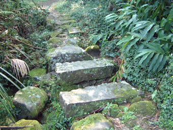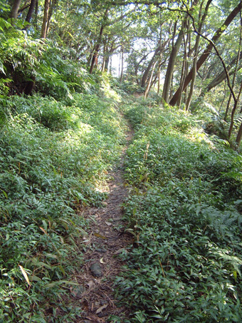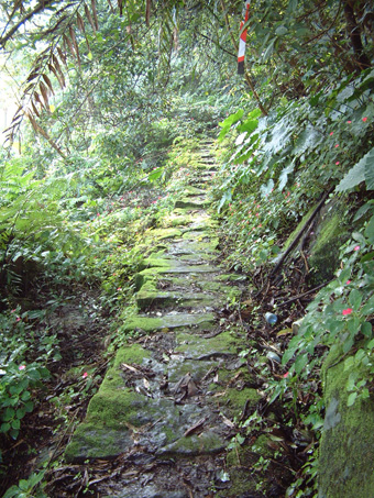 我雖曾多次前來「茶山步道」閒走,惟此小徑先前被芒草及杉木林所淹沒,未曾走進過。今日周邊的林下首見清楚的泥土阡陌全貌,好奇心的趨使下,便與Ery再次走入另一種別於「茶山步道」與先前「炮子崙步道」的青苔石階小徑。