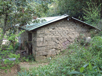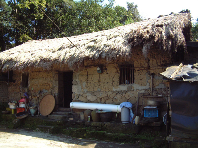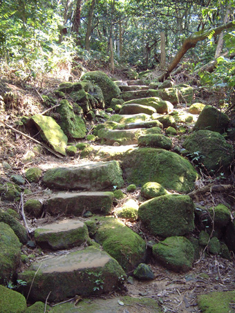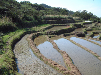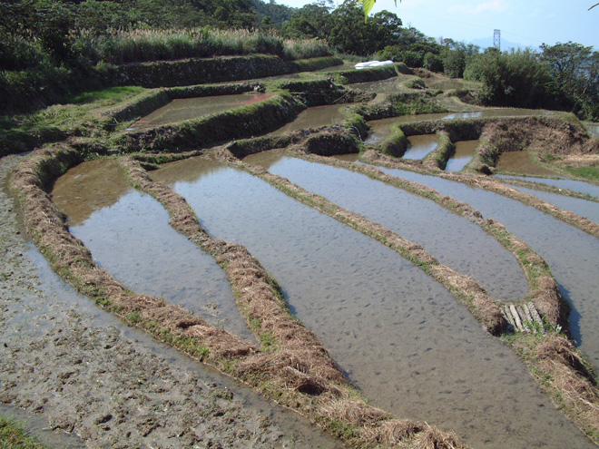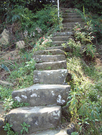 我猶如識途老馬般的熟門熟路,帶領老友們一路循著石階道或泥土坡路,朝往「林家草厝」的終點目標前進。一群快樂的老女人,喜悅心情下所播放的高音頻及嘹亮笑聲,被我刻薄、誇張的形容是:隔了三座山都能聽見她們無節制,釋放在清淨山林間的快樂! 「茶山古道」令人著迷處,是在於她仍是一條「活」的古道;與一般已被隱棄在蓊鬱深林間的古道,大異其趣的仍存在著許多「活」的東西。其中,尤以「林家草厝」的一切人事物,足是「茶山古道」的最佳見證。也經由對「林家草厝」仍保有早昔山區生活的粗淺認識,讓旅人真正了解到「百年地僻柴門迥,五月江深草閣寒」的簡樸歲月;及激起旅人「門前遲行跡,一一生綠苔」的隱世嚮往心、。 行抵至「茶山古道」中途的岔路,另有一條幽徑可前往屬於「林家草厝」的另一畝水田耕作地(此處並非是位於草厝正前方的那一畝水田)。我暫先拋下一夥兒早已氣喘噓噓、臉紅脖子粗的老友們,獨自前去會晤我「心中的那一畝田」。 |