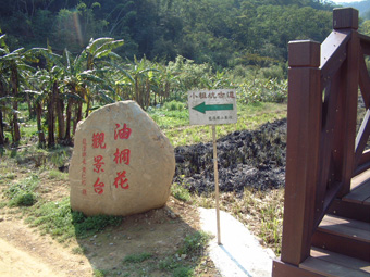 清晨,在新店捷運總站接上「蕭郎」後,車行往北二高、南下「龍潭」的方向前進。下「龍潭交流道」後選擇往石門水庫的車行方向,再走往關西方向的「台3乙」省道前進;「蕭郎」提醒我沿路要注意「崑崙藥用植物園」的路標。從「龍潭交流道」轉下後,約是10餘分鐘的車程時間,便抵達一處「粗坑窯藝文空間」的產道旁,停車於此。 春雨滋潤後的低海拔山間,蝶影紛飛、新綠迎人,正是郊外踏青的好時機。據搜尋網路資訊得知:「龍潭地區的『小粗坑古道』開闢於日據時代,當時是一條牛車路,可通往石門水庫」。原來此古道是一條早昔農家進出山區、從事農作的牛車路,怪不得整條古道的寬敞,迥異於往昔我曾行走過,一般隱密於山間蜿蜒型的羊腸古道。 從「粗坑窯藝文空間」的產道前行不遠,橋墩旁的高大樟樹下有座白牆的土地公廟矗立著。趨近細看「原佑福德祠」及祠前古樸的香爐,但覺質樸有趣及歡喜心立現!古道旁的入口處,另建有寬敞木質階梯的油桐花觀景台一座。此季節的桐花尚在抽新芽的萌發期,但想像著在「五月雪」盛開的時刻,滿山遍野桐花隨風飄落的美景,應是吸引人潮的觀光好賣點。 |