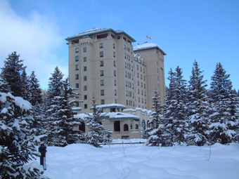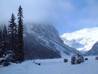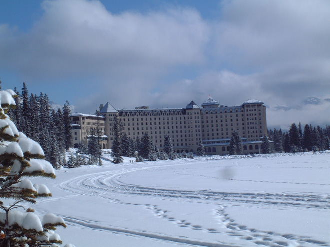 第二天的行程,是此行的重點-露易絲湖滑雪及健行。清晨出發前往「露易絲湖」的路上,第一次看到洛磯山脈的野生動物-「大角山羊」(BighornSheep)出來覓食,可惜車程行進中,無法隨意的路邊停車。 「露易絲湖」素有「洛磯山藍寶石」的美譽,其名稱的典故,聽導遊的解說是如此的:在她尚未被發現前,印第安的原住民是以「小魚湖上的大雪山」稱之;後被以「碧湖」再到「翡翠湖」(EmeraldLake)之名著稱於洛磯山脈。再度更名為「露易絲湖」,是因為在英國統治加拿大時期,維多利亞女王(QueenVictoria)的四公主-露易絲公主,下嫁於當時的亞伯達省郡王,而將此湖泊的優美景色媲美於露易絲公主,便以其名字傳喚沿襲至今;聳立於湖畔、終年皚雪白頭的山峰,則是以「維多利亞山」喚稱。 在「露易絲湖」半日的旅遊活動選項中,我和我老姐因慮及年邁父母親的體能狀況,因此,我們僅選擇穿戴籐編的「大腳鞋」,輕鬆的漫步在已結凍、雪深及膝的「露易絲湖」上。抵「露易絲湖」時,雪地的朝陽亮麗的刺眼,戶外的低溫則僅是零下9℃左右。幸好我們一家人都有多年寒帶氣候的生活經驗,否則,面對如此的低溫,一般的年邁長者,恐會有心血管毛病發作的高風險隱憂。 |
