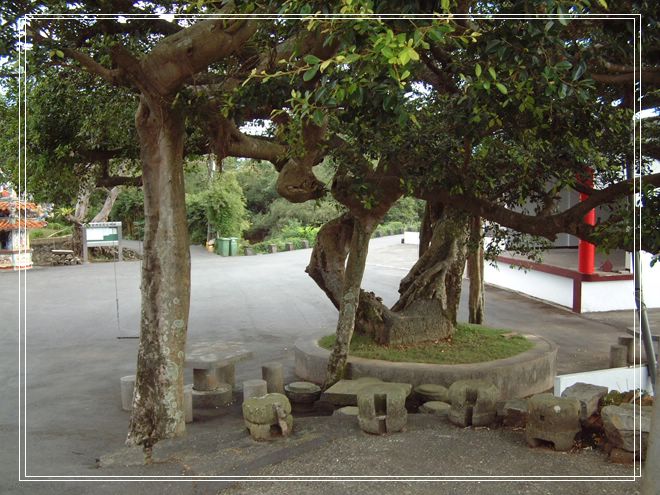 「福安廟」廟前廣場的老榕樹,灰褐古樸的壯碩氣生支柱幹,在季節輪迴中無聲息的滋長開來;綠蔭的庇蓋遮蔽了耀眼的陽光,樹下散落有新舊的石桌椅,人與自然相處和諧的氛圍,於焉形成。此處應是雞母嶺村內居民促膝長談,閒話家常的好地方,老榕樹下另有一塊日據時期的捐款紀念碑,以及數座圓形雕刻的舊時廟座基礎,仍物盡其用的散發著繁華落盡的蒼桑!!