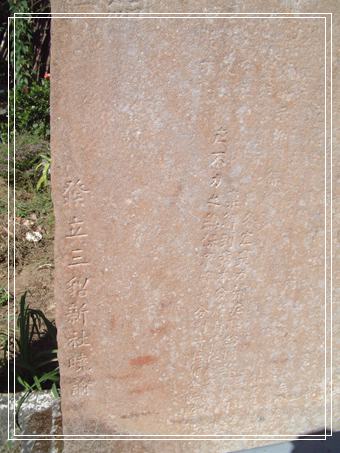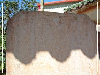 「慈仁宮」,也是我今日來「田寮洋」尋幽的重點之一。在走過爬滿藤蔓的石頭厝之後,「慈仁宮」廣場上已風化到模糊的古樸石獅子,見證著屬於「凱達格蘭族」 三貂社的住民,曾活躍於「新社」的歷史記憶。 倘以我喜古樸事物的習性,「慈仁宮」富麗堂皇的廟形外觀,是絲毫吸引不著我停駐的腳步。不過,因據資料顯示,門牌號碼為貢寮鄉雙玉村田寮洋街13號的「慈仁宮」,遺留有舊時「凱達格蘭族」(KETAGANAN)人登陸台灣後,建立的第一個部落-「三貂社」的諸多歷史古蹟,其意義自是非同小可。 「慈仁宮」廣場上靠近遭遇風災毀損,尚在封橋中的「新社橋」端,另豎立有兩塊已略脫膠膜的鐵製佈告牌,陳述著三貂社的沿革,以及「淡水同知」嚴禁持械、擄劫石碑文的全部內容。 距今1800年前,漢人尚未大規模渡海來台之前,北從基隆、南到桃園地區,整個大台北區域都是屬於「凱達格蘭族」的活動範圍。而據學者考證,「凱達格蘭族」人 在台灣建立的第一個部落-「三貂社」的原址,便是現今貢寮鄉的雙溪河(三貂溪)口(今龍門村海邊)附近,後因故從舊社原址翻越到「番仔山」(現今貢寮核四廠後山),後再遷徙至「田寮洋」附近的區域,乃稱「三貂新社」。
