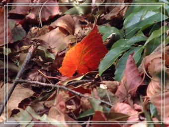 前行至第一處休息區的步道兩側,隱藏在溪谷的綠色森林裡,有一抹抹的紅豔隱約可見,再前進的乾爽步道上,飄落著由「台灣紅榨槭」落葉鋪成的紅毯道,煞是美麗。猶屬新鮮紅豔的心形落葉,透過落下的陽光閃爍著熠耀光影,讓人的眼光不忍片刻離棄!