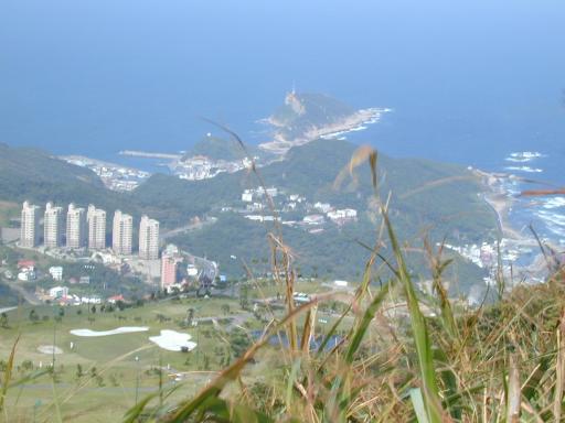 丁火巧山基點。山頂有天線。天線有圍籬。鳥瞰野柳方向。近處是翡翠高爾夫球場。遠望金山方向。山頂有下往翡翠高爾夫球場的山路。可由北基新城回到萬里。 |
