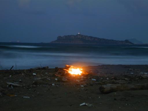 釣客用浮木升起的火堆。遠望野柳燈塔的亮光。 |