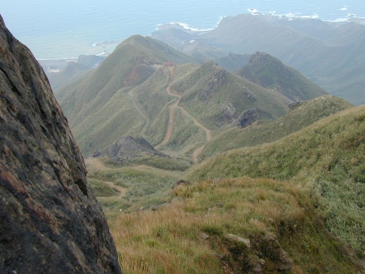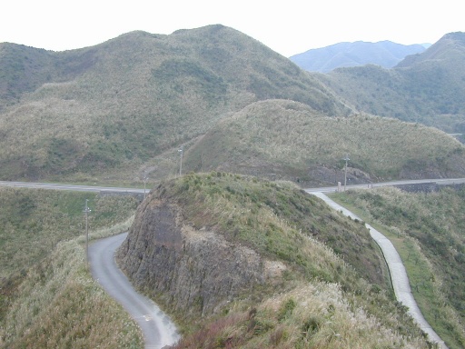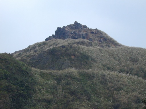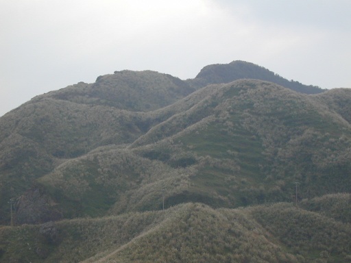路右燦光寮山登山口。兩登山口相距只有二十公尺。繼續沿公路前行可到草山,南草山。遠望草山。山頂平平,有建築,公路可直達。半屏山之所以稱之的理由在此。西半部芒草,東半部樹林,界線分明。遠望草山與半屏山之間的海岸。 |