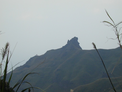 仰望大粗坑山。後來知道不是大粗坑。仰望山頭旁的電塔。遠望茶壺山。 |