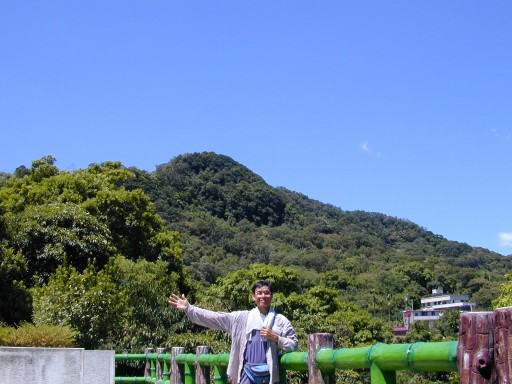 過外股橋,左側有枕木步道往上。步道上眺望猴山岳。 |