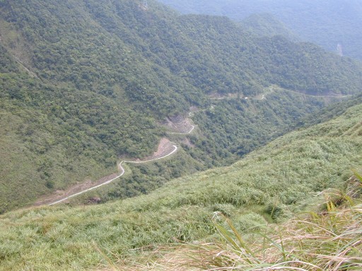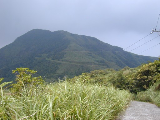 叉路,右側水泥車道上往草山,山頂有電台。續直行。眺望燦光寮山,前方車道盤旋上至山腰而過。 |