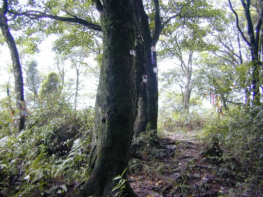 加九嶺山頂,有幾顆大樹,山頂標示牌很多,沒展望。山頂拍照留念。 |