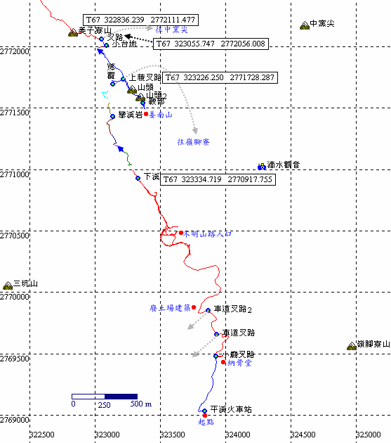 又遇見先前的廢土場人員,他很熱心的幫我指明水路的大概。知道我想走稜線山路,還帶我去看一處山路入口。該山路上去後相當明顯,據說可登頂,然後往南循稜,無路條。可惜不是我想要的。告別,續往前,回水路入口。 |