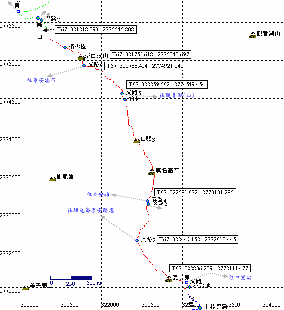 沿路找登山口,徒勞無功。決定轉水路,從反方向循稜,放棄姜子寮山。 |
