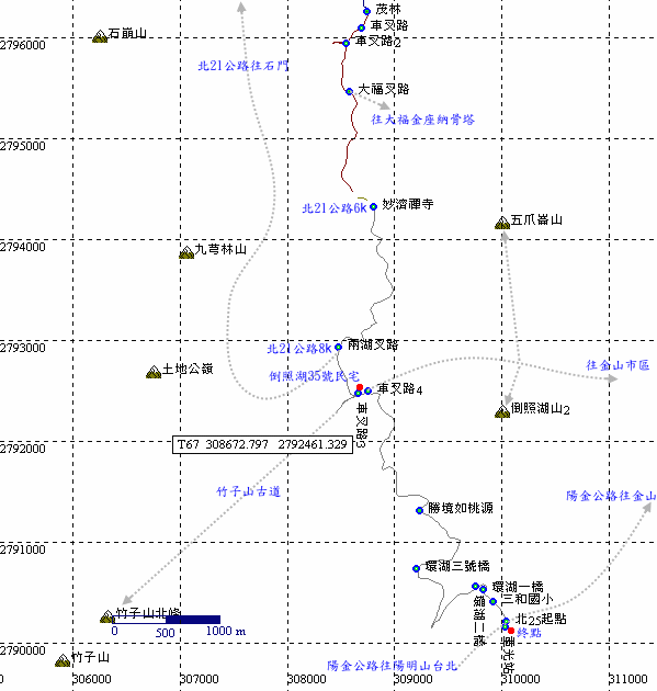 叉路,左前往兩湖金山,右續行北21可往石門。休息決定行止,左可往探竹子山古道入口,下抵陽金公路;右可繞回石門,順探阿里磅山的新點。遠眺土地公嶺,也是平凡無奇。 |