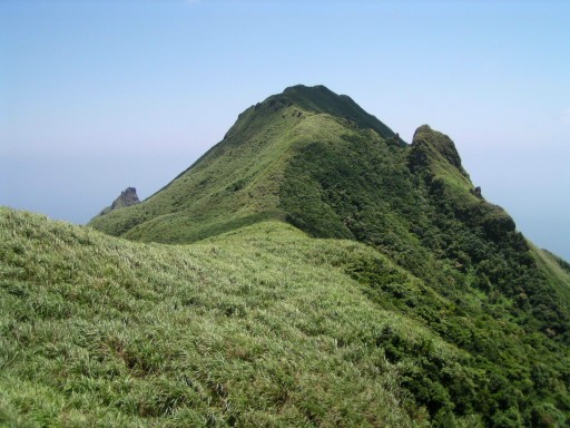 上稜,首先映入眼簾的就是今天的主要目標──草山,其後為草山南峰與南草山。草山不愧是草山,滿山幾乎都是芒草,形成美麗的淺綠。眺望苦命嶺附近群山,和美山苦苓嶺南雅山鼻頭山山形都不明顯,但依相對位置,仍可大約分辨。瞻仰一下剛剛爬上的陡岩坡,高約20公尺。眺望茶壺山基隆山與金瓜石。 |