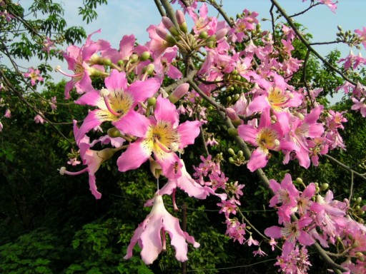 清水岩路上的行道樹正開著亮麗的大花。粉紅色大花相當艷麗,吸引很多蜜蜂光臨。眺望前方的鳳山,是一座狹長平緩的小山,不過在左側靠西方有明顯突起岩石,可能就是有名的獅頭岩。 |